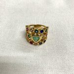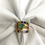 Anel com 3 fileira de zircônias coloridas cravejado, na fileira do meio com um coração na pedra fusion.