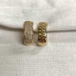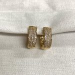 Brinco argola oval médio com 5 mini fileiras cravejada de zircônias na frente e nas costas trevinhos vazado.