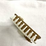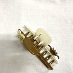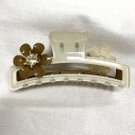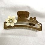Piranha de cabelo no tamanho GG retangular na resina vazada no meio com uma flor de cada lado na cor marrom e branca, com um strass no meio.