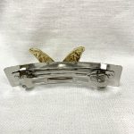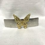 Presilha de cabelo retangular grande escovada no prata, com borboleta grande riscada no dourado ao meio, toda de metal.