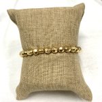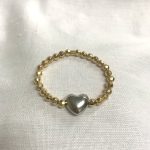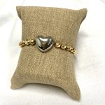 Pulseira com com bolas pequena diamantadas no dourado com coração médio liso no ródio branco no meio, no elástico.