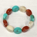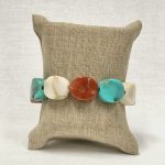Pulseira resina oval achatada na cor azul turquesa, vermelho terracota e bege com mesclas